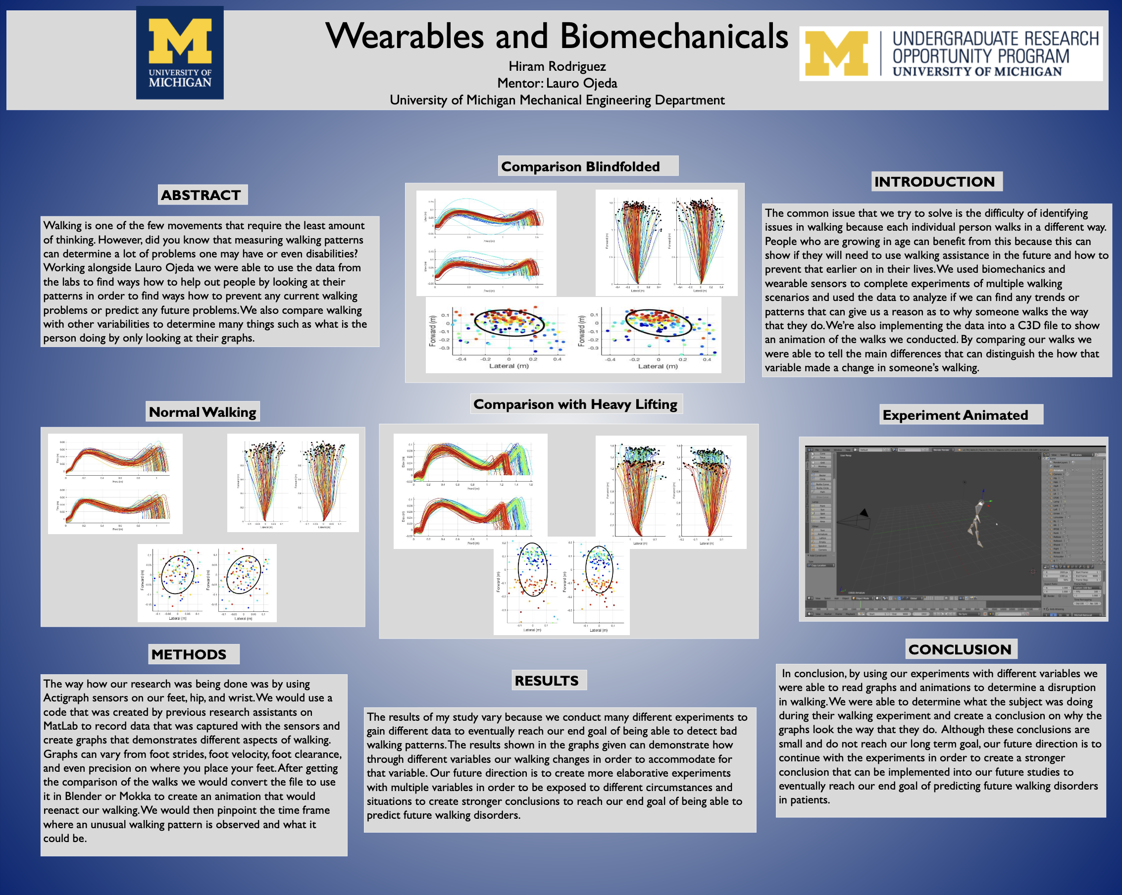 In the first year of my collegiate career, through the Undergraduate Research Opportunity Program, I was able to apply and be assigned the Biomechanics and Wearable Sensors research project that was supervised by Dr. Lauro Ojeda. During my time, I held experiment testings by placing wearable sensors on all key joints of the body and then tasked the subject with different variable to see if there is any difference in their walking patterns. I also assisted in polishing the Matlab code that was used to sort through this data. After the collection of key data points, I would then transfer the data into blender and create a visual animation representing the testing results. In the end, there was a clear difference in the length, height, and accuracy of the walking strides depending on the variable. This information was used with the U-M Hospital and participating patients in hopes to better understand their walking disability.